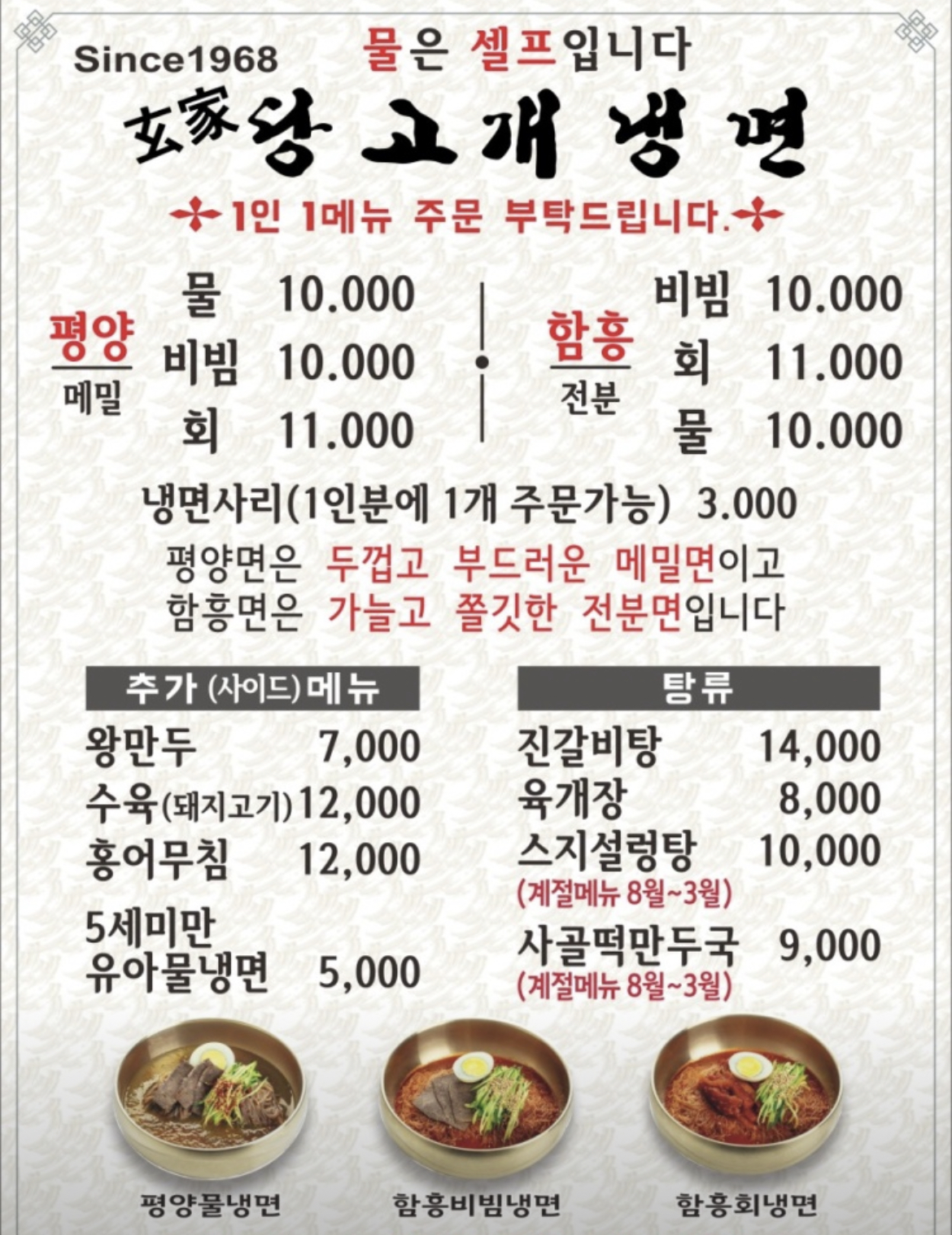 당고개냉면은 특이하게 평양냉면와 함흥냉면을 둘 다 하는 집입니다~~ 서울에 유명 냉면집을 많이 가봤는데, 이렇게 둘 다 각각 다른 제면으로 평냉와 함흥냉면을 둘다 하는 곳은 못본거 같아요~~~