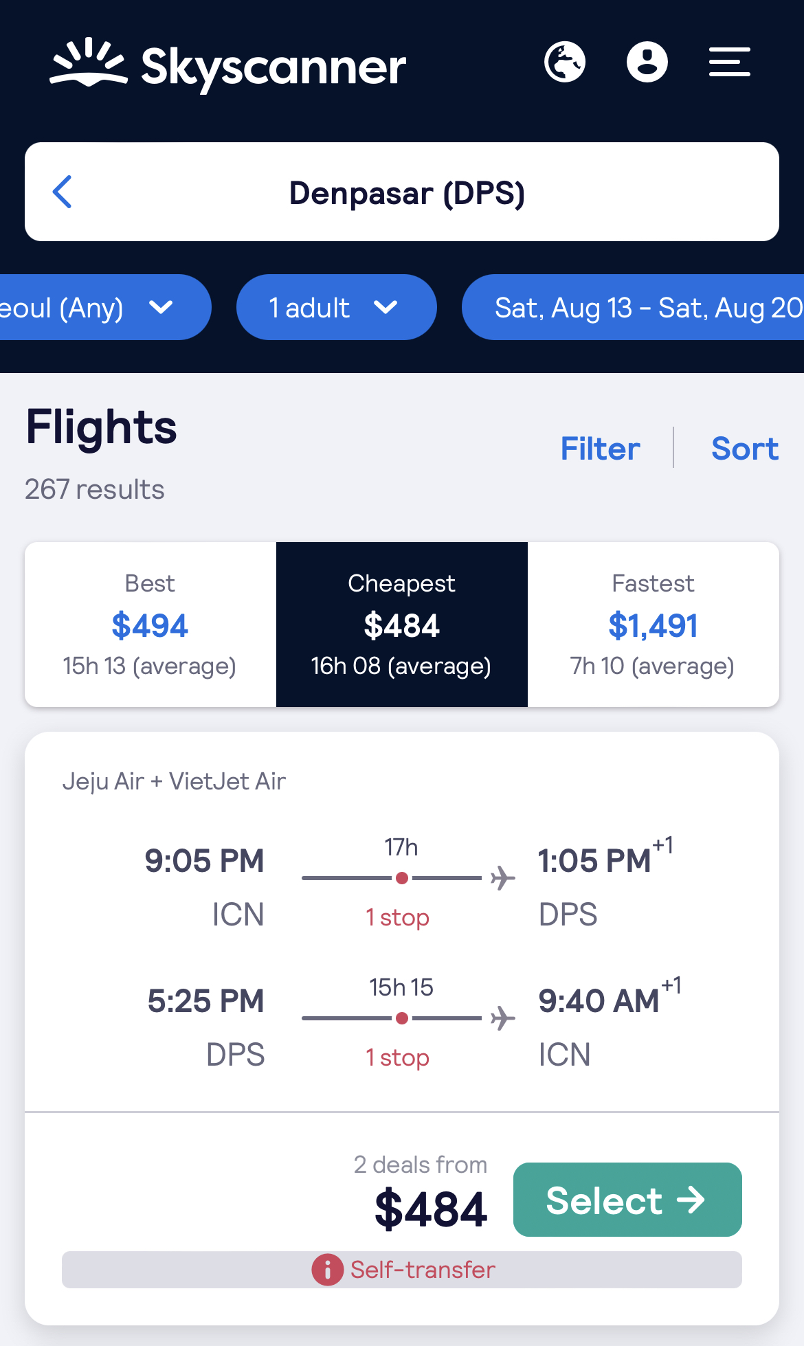 가장 빠른 연휴인 광복절 연휴로 조회해보면, 484$ 약 63만원 정도로 왕복 이코노미로 갈 수 있네요~ 호치민 경유 티켓인데, 다만 중간 경유 시간이 좀 기네요 ㅠㅠ